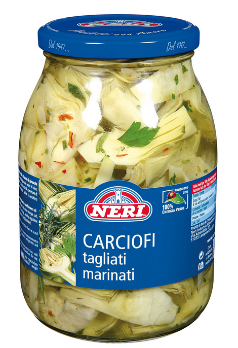 Anghinare taiata marinata Neri 950 g – o specialitate italiana de gustat neaparat: Carciofi tagliati marinati! Combinata cu parmezan si masline negre, reprezinta un mix ideal pentru a da gust si fantezie unei salate verde de valeriana. Pentru doritori se poate completa cu cateva cuburi de pancetta si otet balsamic!