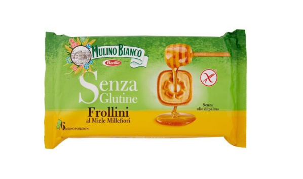 Biscuiti italieni Frollini cu miere de albine Mulino Bianco 250g – fara gluten – Produs specific formulat pentru persoanele cu intoleranță la gluten. Ingrediente: amidon de cartofi, amidon, făină de porumb, zahăr, ulei de floarea soarelui, miere 2,9%, ouă proaspete, aromă (lapte), lapte praf degresat, agenți de creștere (carbonat de amoniu), proteine din lapte, sare, emulgator: lecitina de floarea-soarelui, poate conține urme de soia.