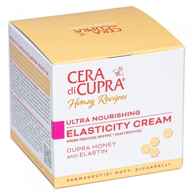 Crema pentru ten normal Cera di Cupra Elasticizzante pe baza de miere, elastina si extract de bumbac. Elastina este o proteina asemanatoare colagenului, a carei sinteza scade odata cu varsta. In plus, contine un complex vegetal de uleiuri nutriente: masline, in, migdale si borjeana sau ”Limba mielului”. Acesta are o actiune nutrienta si de protejare impotriva factorilor externi. Folosita frecvent, aceasta crema reda elasticitatea tenului.
