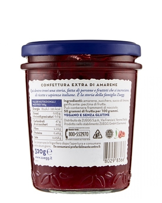 Dulceata italiana de visine amarene Zuegg – un produs vegan obtinut din fructe de foarte buna calitate, fara conservanti, doar cu ingrediente naturale.