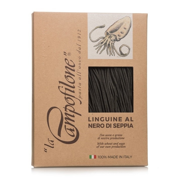 Paste italiene cu ou Linguine cu cerneala de sepie 250g La Campofilone – Paste artizanale, produse pe filiera inchisa, in sensul de filiera de proprietate Campofilone. Toate materiile prime necesare sunt produse la ferma Campofilone, in regiunea Marche. Preparate cu cerneala de sepie lichida, fara coloranti sau conservanti.
