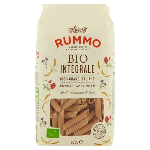 Paste Italiene integrale Bio Penne Rigate Rummo sunt preparate cu semola de grau integrala, calitate Bio.