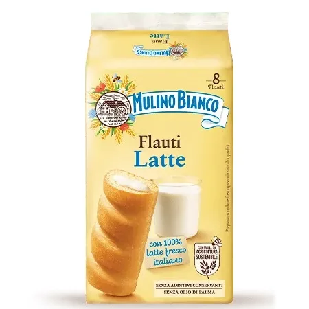 Prajiturica Flauti cu lapte Mulino Bianco – O prajiturica obtinuta dintr-un aluat pufos, fermentat natural, umplut cu o crema delicioasa de lapte.