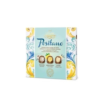 Praline asortate Positano Pralinesse Crispo sunt praline invelite cu ciocolata cu lapte, umplute cu creme asortate si cereale crocante: Crema Stracciatella, Crema de lamaie, Crema Chantilly.