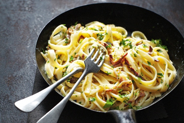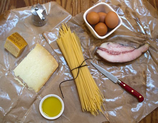 - Jane Bills (@LetThereBeBite) Carbonara: Prepara cat mai simplu: oua, poate putina smantana, fara ceapa. Puristii spun guanciale, pe mine nu ma deranjeaza pancetta.